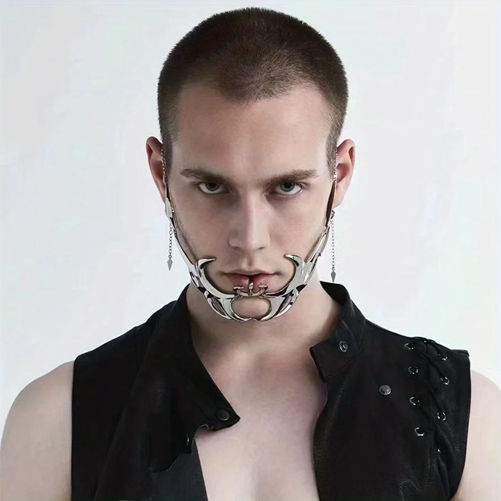 Futuristic metal face mask with sculptural silver design, created for experimental fashion, parties, photoshoots and cyberpunk aesthetics. Lightweight, adjustable and unisex, it fits comfortably over the face and instantly turns any look into a statement.